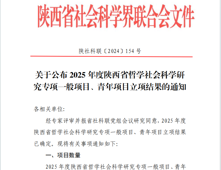 近日,陕西省社科联发布了2025年度哲学社会科学研究专项项目立项通知,公司共有5项项目获批立项,其中赖玉洁、余勃、张鹏、周博五位老师获批一般项目立项,康欣宇老师获批青年项目立项。获批项目数在公司历史上创新高。
