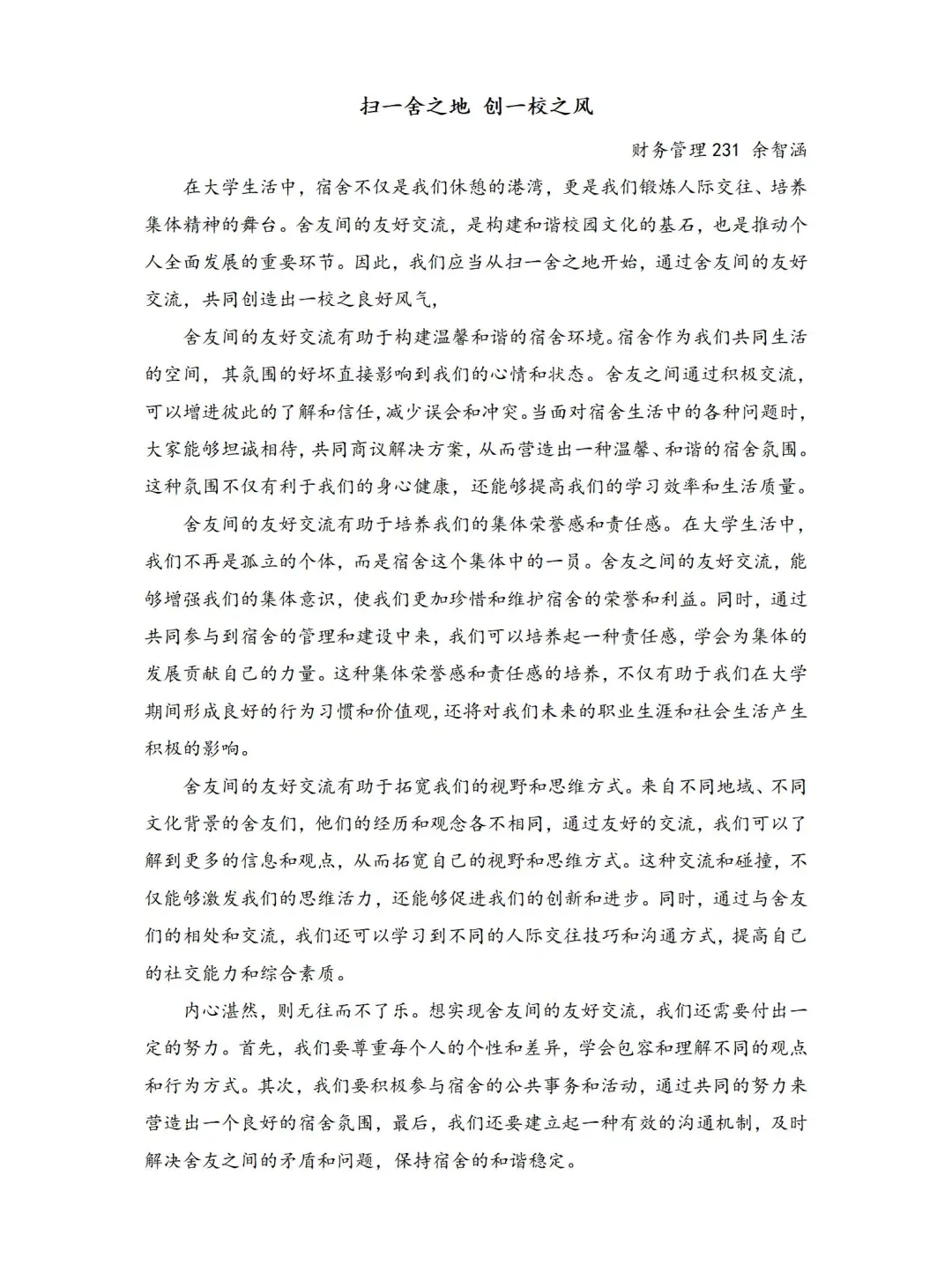本次征文比赛经过层层筛选,财务管理231班余智涵同学的征文脱颖而出,让我们一起欣赏下她的作品吧!