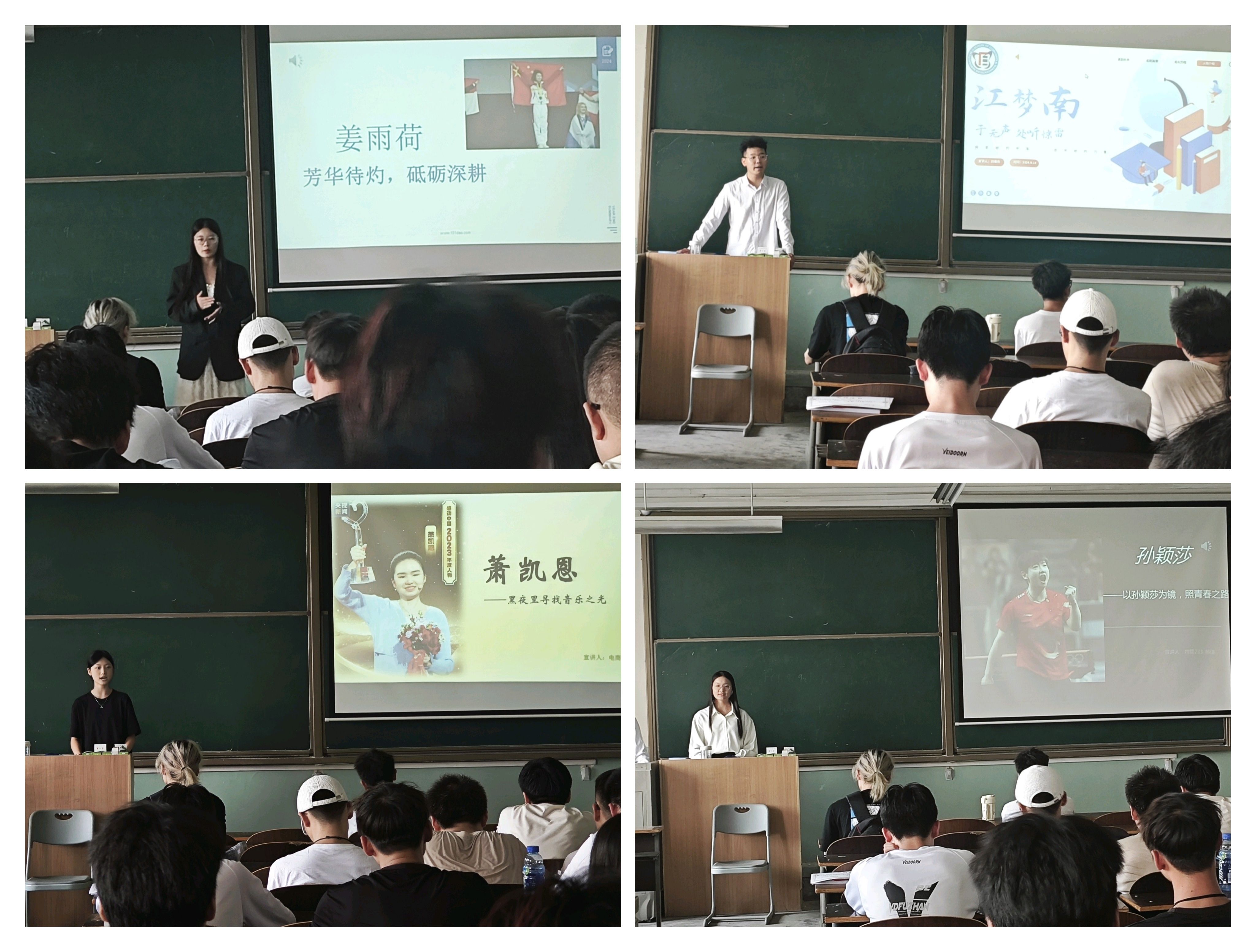 首届宣讲团由物流管理223c班刘俊杰、物流管理233c班郝佳、财务管理233班张玉婷、电子商务233班周怡四位同学组成,他们分别以江梦南的励志人生,孙颖莎在乒乓球世界里披荆斩棘,张雨荷面对挫折困难时的不放弃和勇于挑战自我的精神,萧凯恩的励志经历为主题对电商231、232、233班员工开展了励志宣讲。