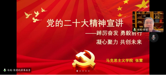 张雷老师以《党的二十大精神宣讲》为主题,以党的二十大报告要点为主线,详细解读了党的二十大的主题、主要成果等内容,重点对二十大精神的丰富内涵和核心要义等方面进行了阐释,对二十大报告进行了深入浅出的解读,为大家上了一堂生动而深刻的专题党课。