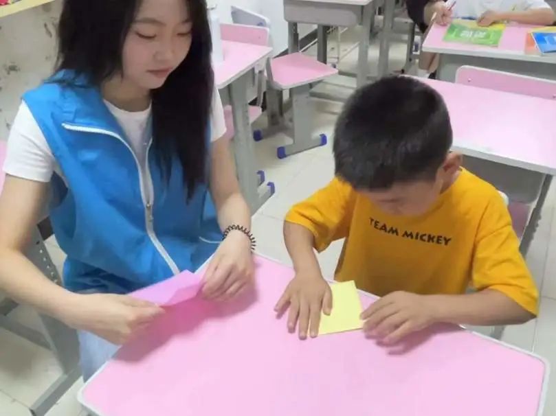 “一鹭童行”实践队队员联合心羽志愿服务中心志愿者在白鹭湾社区小课堂教室对小朋友们进行作业辅导。随后,队员选择适合孩子年龄特点的方式,用他们感兴趣的折纸打开“童心”之门,激发孩子们的学习动机,让孩子们在学习中感受快乐。