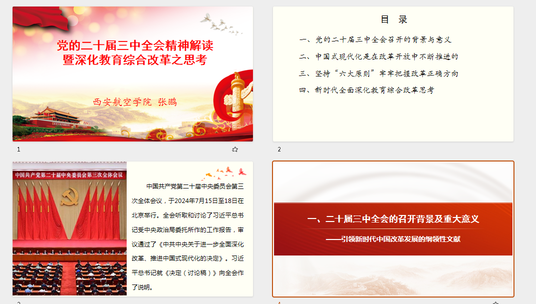 张鹏对公司当前和今后一段时期宣传学习贯彻落实党的二十届三中全会精神做了安排部署,并从党的二十届三中全会召开的背景意义、中国式现代化是在改革开放中不断推进的、坚持“六大原则”牢牢把握改革正确方向、新时代全面深化教育综合改革思考四个方面,结合推进公司高质量发展实际,作了《党的二十届三中全会精神解读暨深化教育综合改革之思考》的专题党课。