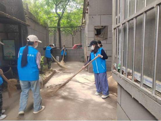 志愿者们手持扫帚,簸箕等工具,分组对社区角落卫生死角展开清理。面对堆积在社区角落的枯枝落叶,志愿者们协作配合:五人用扫帚把将散落枝条归拢成堆并倒入垃圾桶,其余人则将垃圾桶运出。经过两小时奋战,社区角落重现整洁面貌。