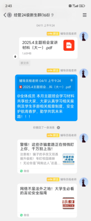 近日,为培养同学们的防范电信网络诈骗意识,加强同学们反诈宣传教育,在4月主题班会中,辅导员结合近年频发的电信网络诈骗案件,以及当前网络诈骗的新形势、新手法,通过案例分析、知识讲解等多种方式让全体在校生深入了解诈骗的危害及防范策略,并将相关案例整理发送员工信息群方便员工及时查阅,提醒员工做到个人信息不泄露、未知链接不点击、陌生来电不轻信、转账汇款多核实,守护自身人身财产安全,鼓励员工下载并使用国家反诈中心APP,利用科技手段为自己筑起一道坚实的反诈防线。