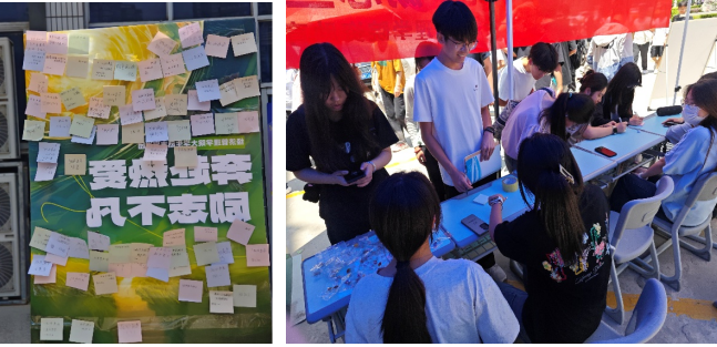 5月29日中午11:30,宣讲团在航益食堂展开了预热活动。同学们纷纷在便利贴上写下自己的祝福、愿望或励志话语,小小的便利贴承载着大大的梦想,贴满了展板,成为校园里一道亮丽的风景线。参与活动的同学还获得了精美胸针,并踊跃报名晚上的正式活动。现场气氛热烈,许多同学表示:“这样的活动既暖心又有意义,让人充满动力!”第二张和第三张图片记录下了这些温馨的瞬间,每一张笑脸都是对活动最好的肯定。